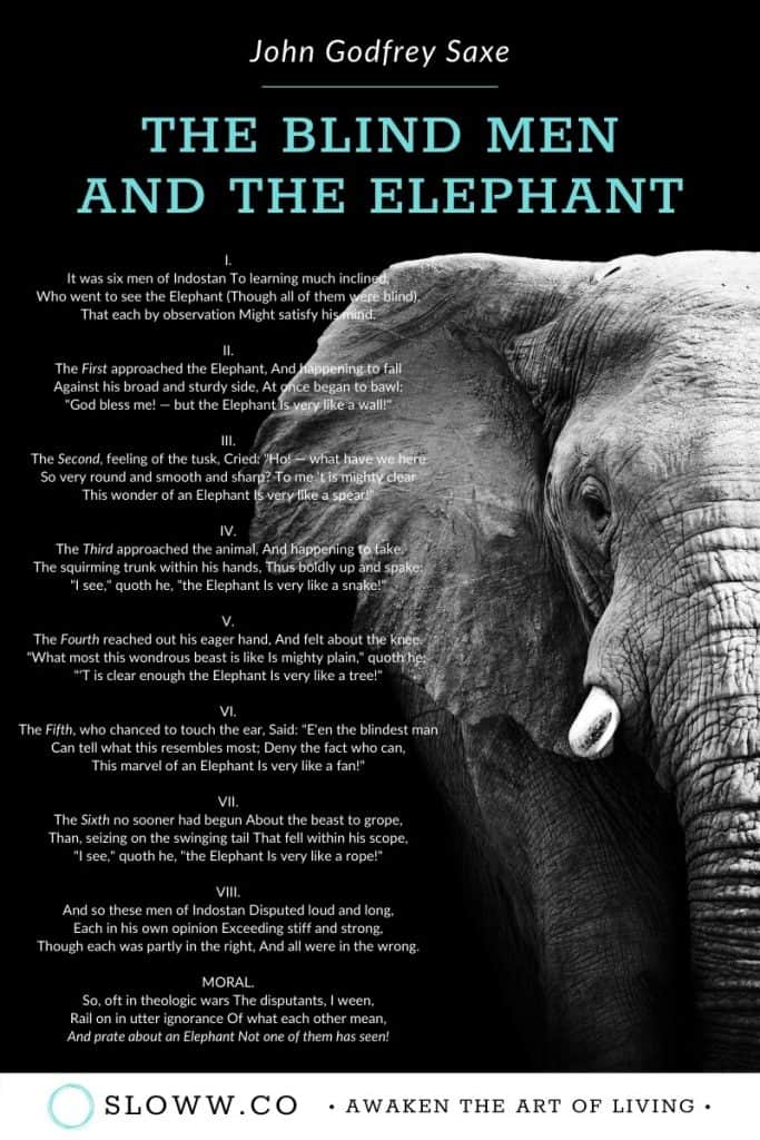 There are quite a few lessons learned from the story of the blind men and the elephant.