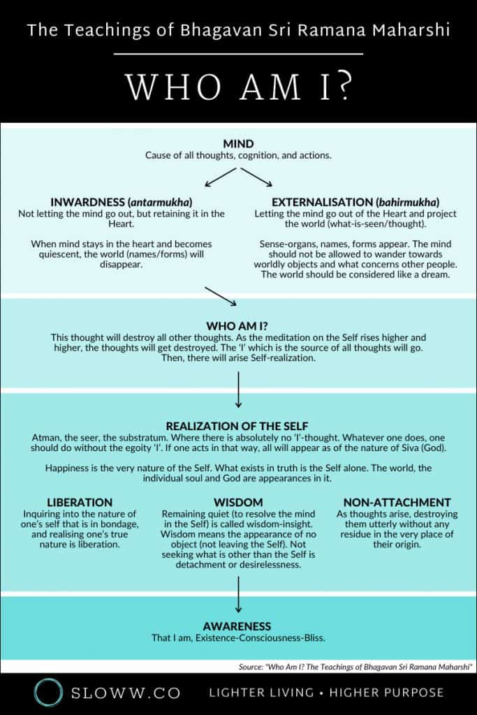 In an attempt to better absorb and digest Ramana Maharshi’s teachings, I created this visual summary for myself which may be helpful for you as well: