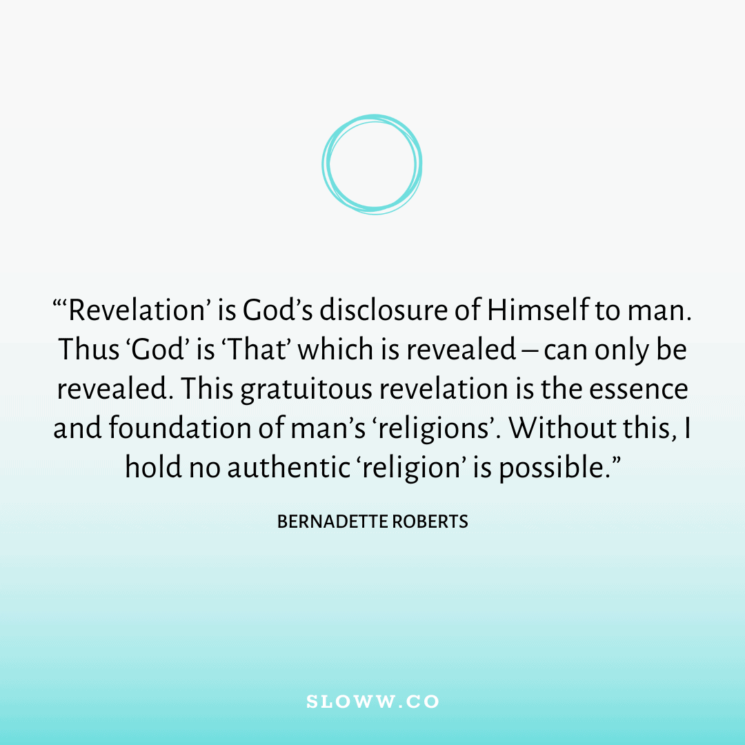 “‘Revelation’ is God’s disclosure of Himself to man. Thus ‘God’ is ‘That’ which is revealed – can only be revealed. This gratuitous revelation is the essence and foundation of man’s ‘religions’. Without this, I hold no authentic ‘religion’ is possible.” — Bernadette Roberts