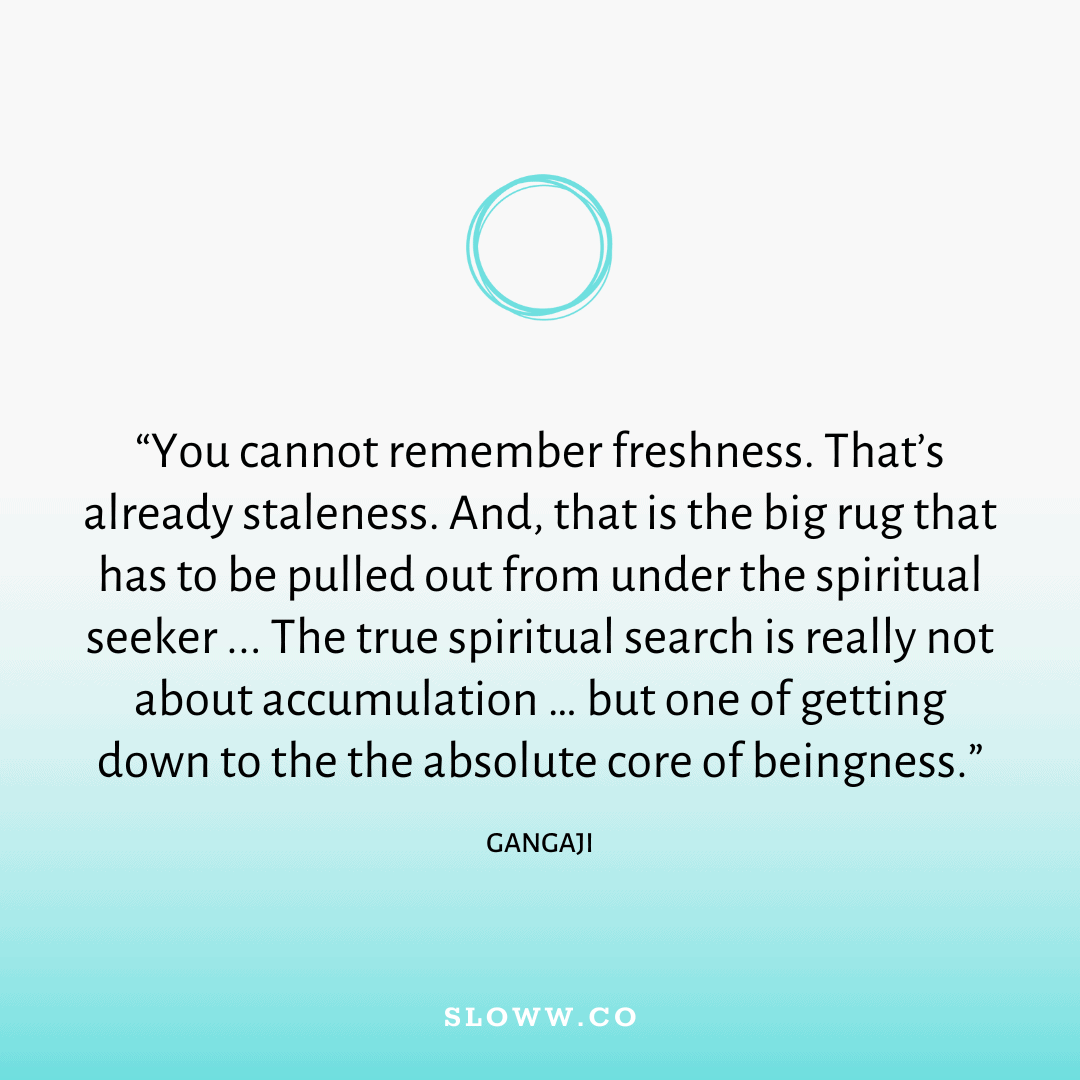 “You cannot remember freshness. That’s already staleness. And, that is the big rug that has to be pulled out from under the spiritual seeker … The true spiritual search is really not about accumulation … but one of getting down to the the absolute core of beingness.” — Gangaji