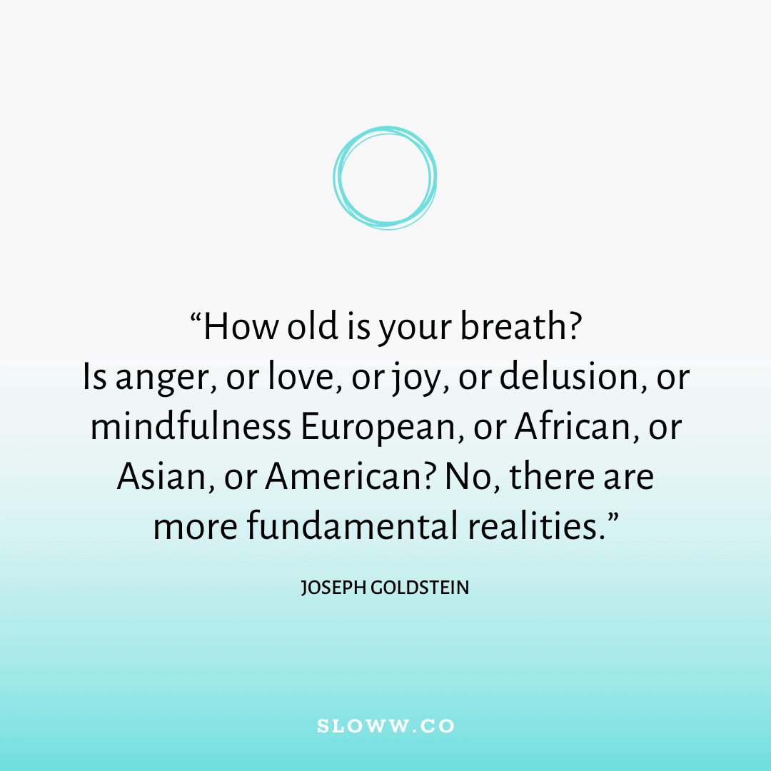 “How old is your breath? Is anger, or love, or joy, or delusion, or mindfulness European, or African, or Asian, or American? No, there are more fundamental realities.” — Joseph Goldstein