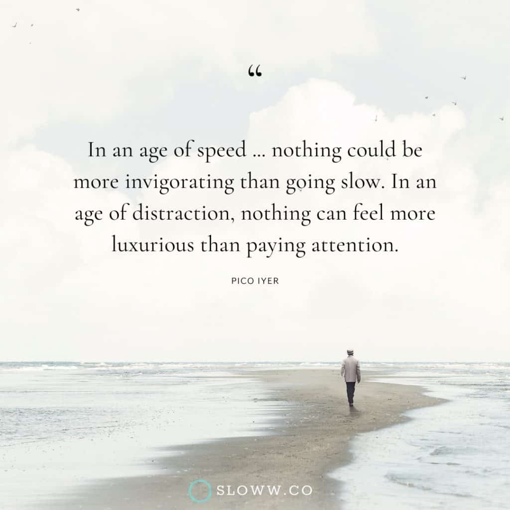 Quote: “In an age of speed, I began to think, nothing could be more invigorating than going slow. In an age of distraction, nothing can feel more luxurious than paying attention.” โ Pico Iyer