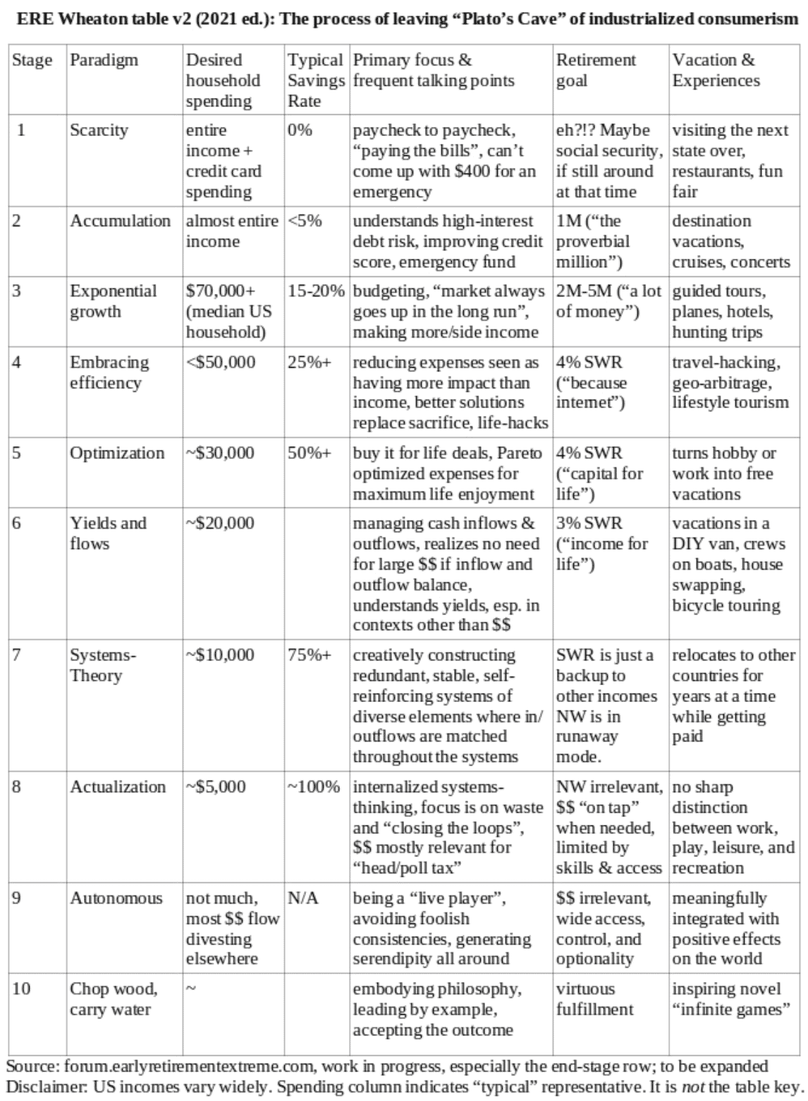 - “The ERE Wheaton Table identifies a few representative mindsets along the personal economics journey as mastery is developed in spending efficiency and overall life skills. These descriptions are based on 10 years of experience talking to different people in the personal finance world.” — Jacob Lund Fisker