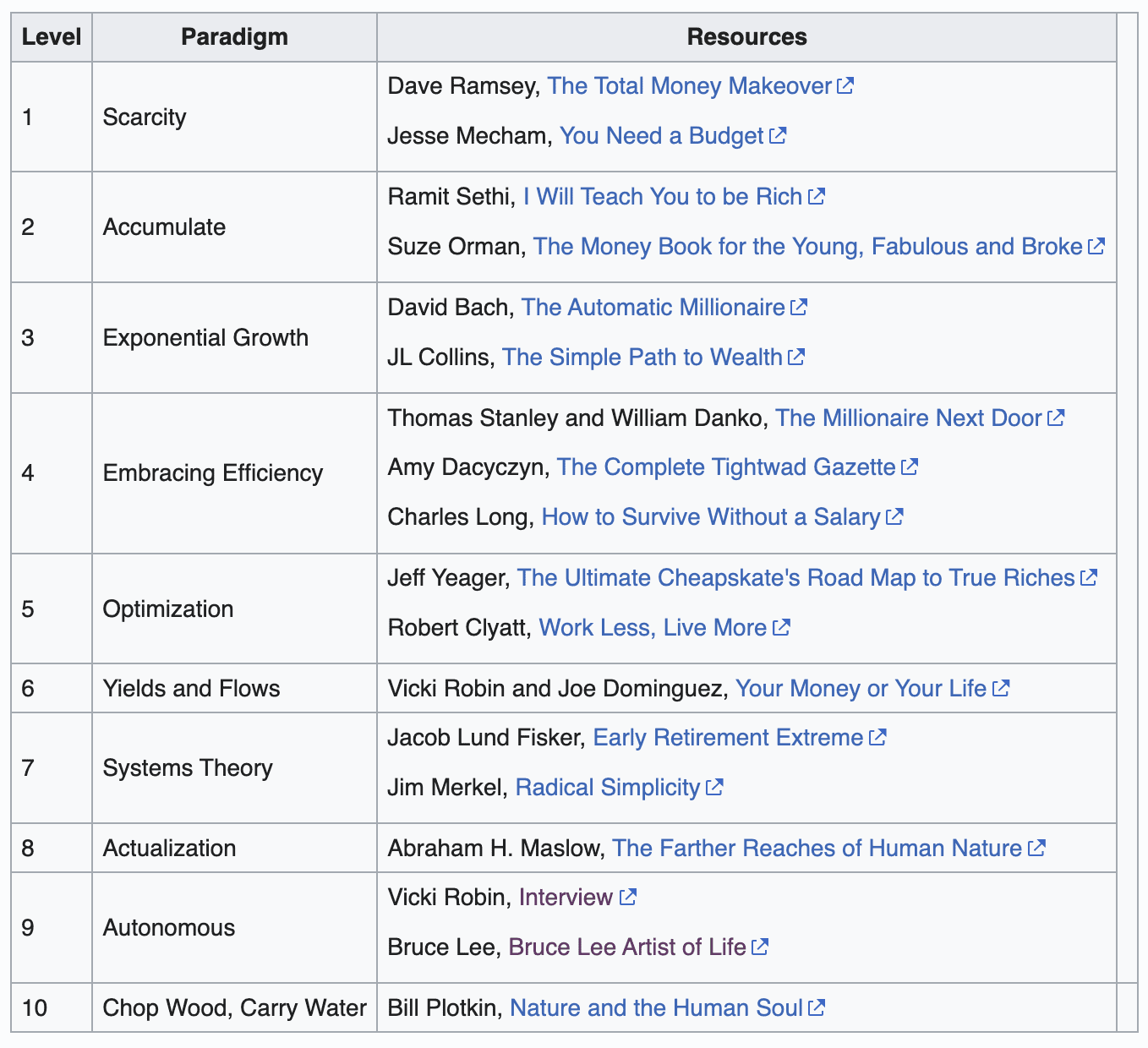 I’ve never come across anything that expanded my mind more about what’s possible with money than Early Retirement Extreme by Jacob Lund Fisker (Book Summary | 🔒Premium Synthesis). And, Jacob practices what he preaches—he’s spent ~$7k/year in total annual expenses for 20+ years (yes, really) and currently has 150+ years of his living expenses covered! He’s also developed something called the “ERE Wheaton Levels” which includes suggested sources based on where you’re at financially and mentally (see screenshots below):
