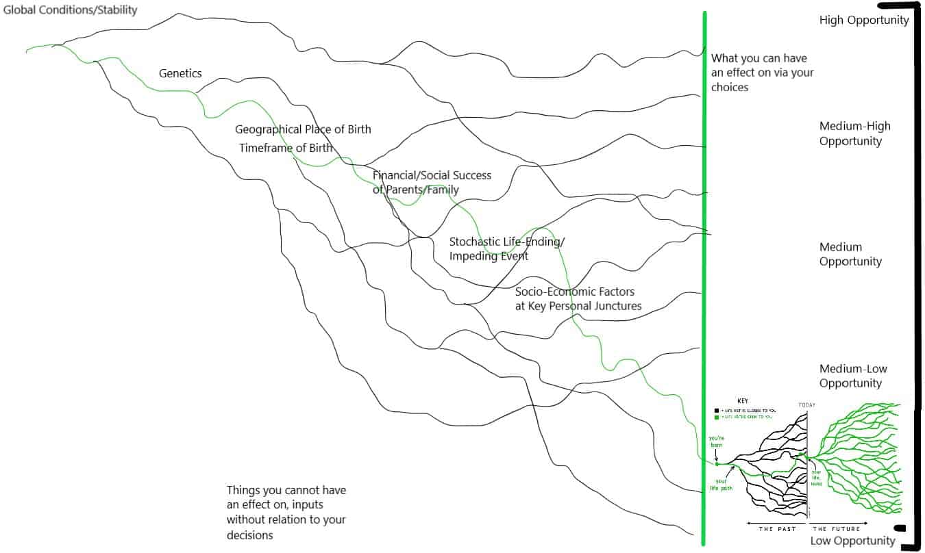To bring this all to life, I finally compiled all my favorite birth lottery videos in one place: 🆕 10 Birth Lottery Videos to Realize Your Luck in Life. If you only watch a few, I recommend starting with #1, #3, and #4. However, video #5 describes it like running a marathon which pairs nicely with the life path images above: