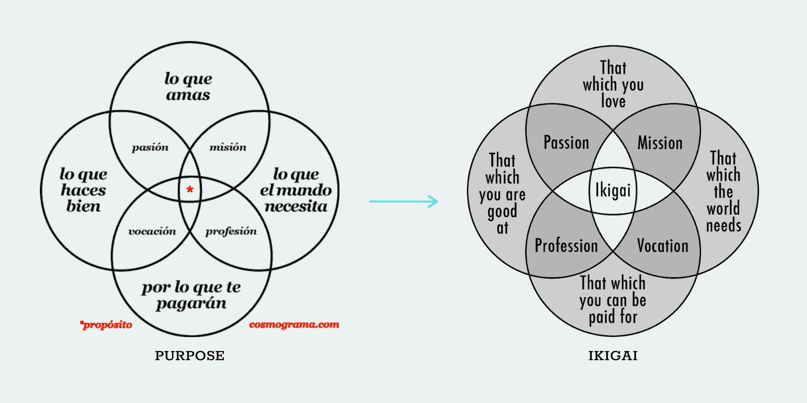 Years later, I’m still surprised more people don’t realize the truth about ikigai. The viral diagram above is not “original” or old—and it’s not ikigai! The diagram was created in 2014 when someone took an existing Spanish diagram for “purpose” and just swapped the middle word for “ikigai.” That’s literally it: