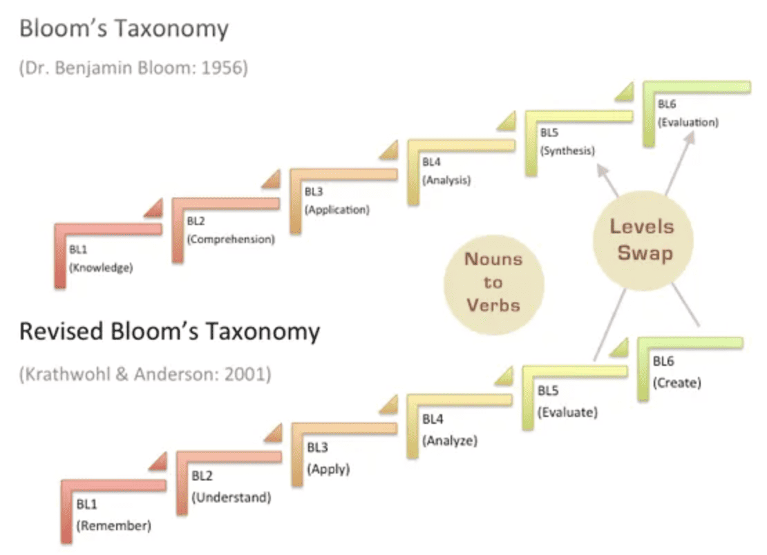 And, another is Bloom’s taxonomy (Wikipedia). Fun Fact: The original version of Bloom’s taxonomy from the 1950s included ‘synthesis’ as the second-highest level. When it was redesigned in the early 2000s, it made synthesis the highest level but changed the name to ‘create’. Either way, it’s clear that synthesizing is one of the highest-order thinking skills one can have: