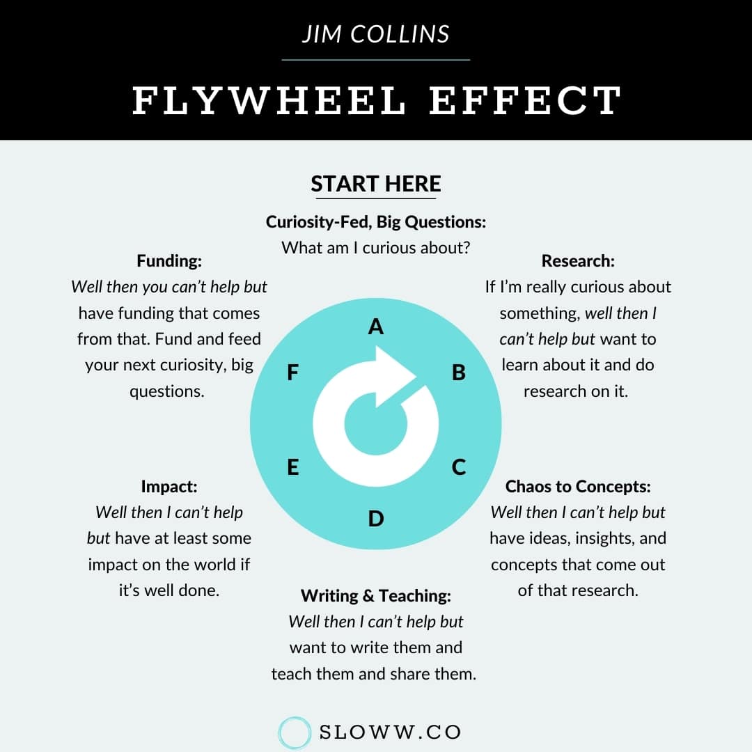 - “A flywheel is an underlying, compelling logic of momentum … there’s an inevitability built in. If you do A, you almost can’t help but do B. And if you do B, you almost can’t help but do C. And if you do C, you almost can’t help but do D. And around and around. And it’s driven around because there’s an underlying connection. There’s a logical sequence that builds dynamic momentum, because A drives B drives C drives D and around back to the top of the loop. Then, if you can kind of stand back and then say, ‘We need to engage in the very hard thinking of figuring out exactly how our flywheel turns. What is our flywheel?’ In a way that truly has that inexorable driving momentum within it.”