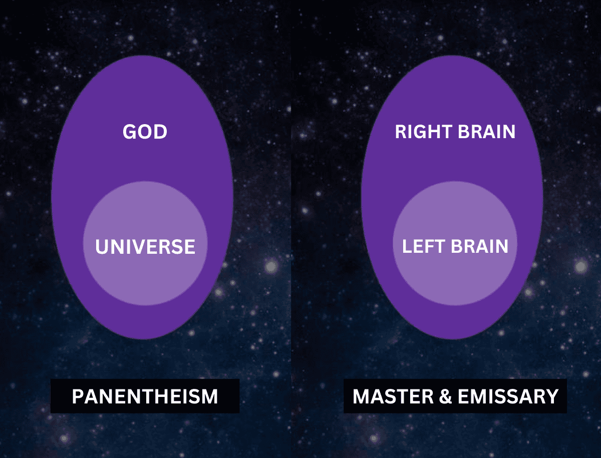 Then, it occurred to me that how McGilchrist sees the brain hemispheres seems to match his view of panentheism: