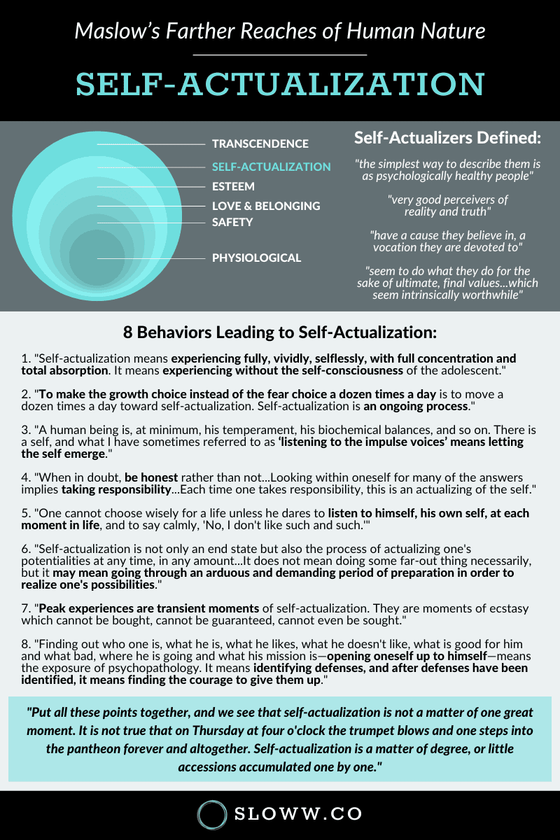 Sloww Premium members can also access the self-actualization synthesis (🔒) and my self-actualization self-assessment (🔒). The synthesis includes bonus infographics on: how to be a healthy self-actualizer & Maslow’s Being-Values/Metaneeds.