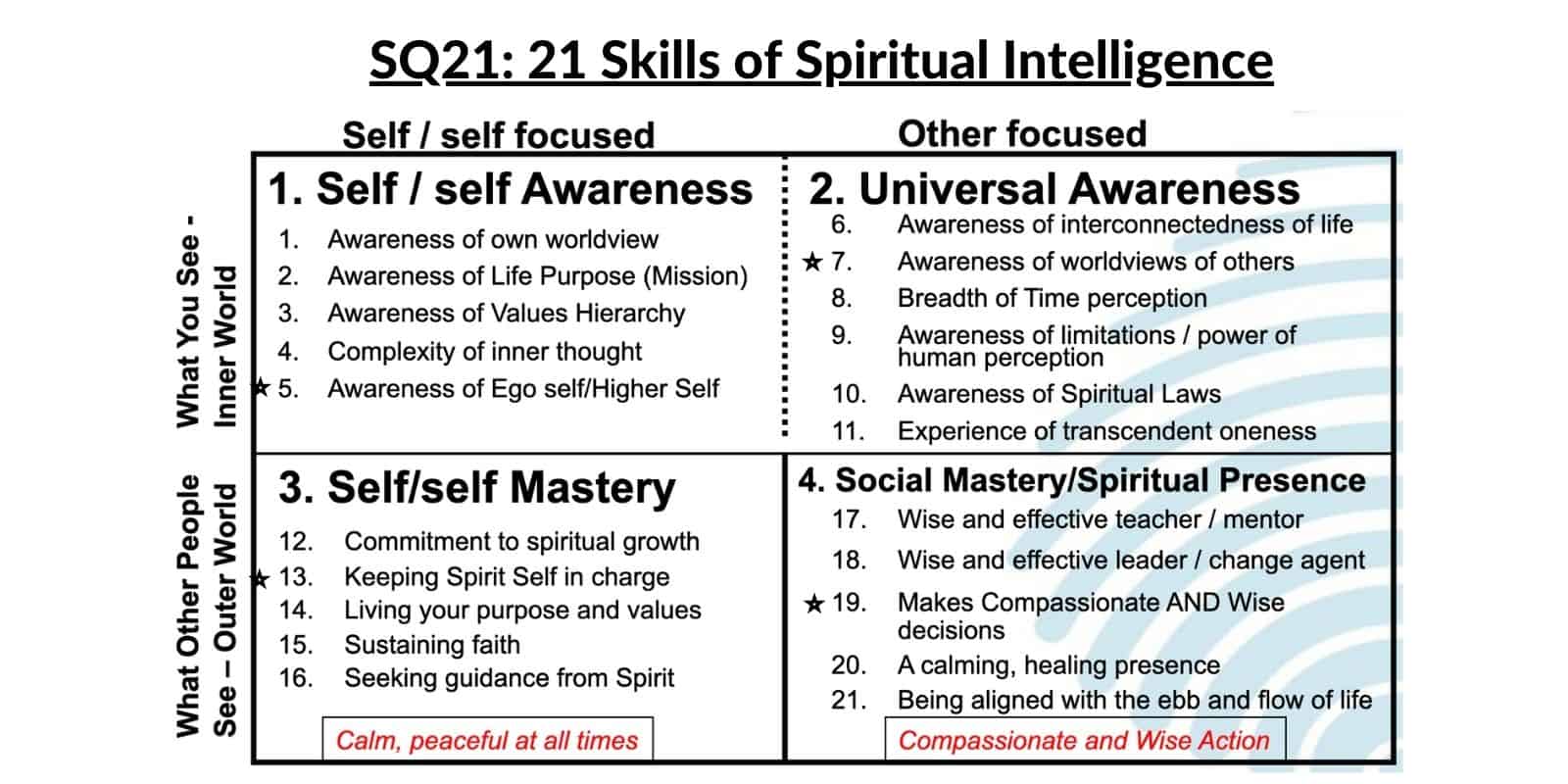 Here’s an overview of the 21 skills of spiritual intelligence (notice the ⭐️ next to some key skills in each quadrant):