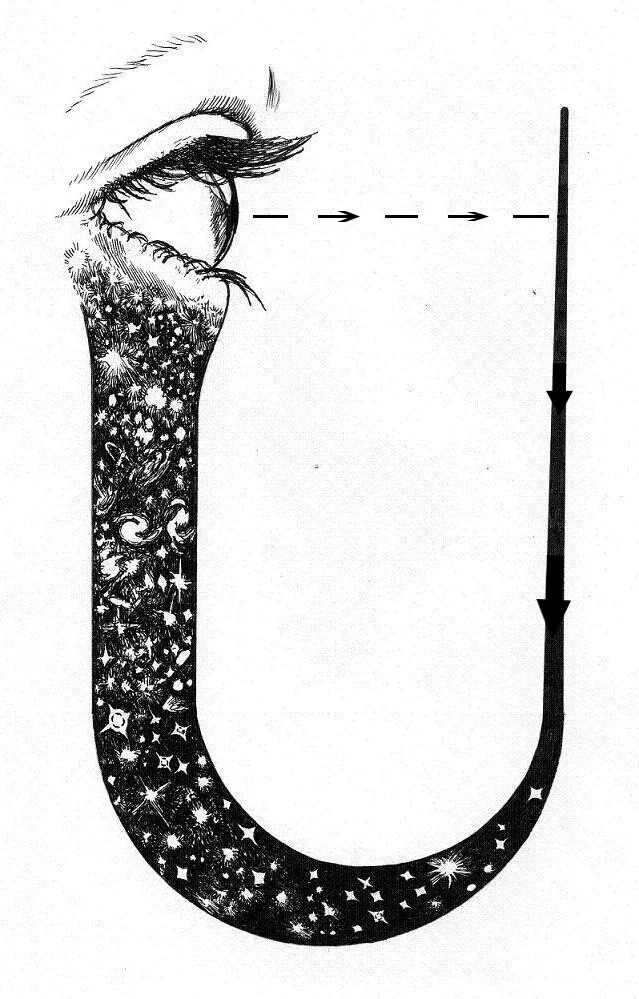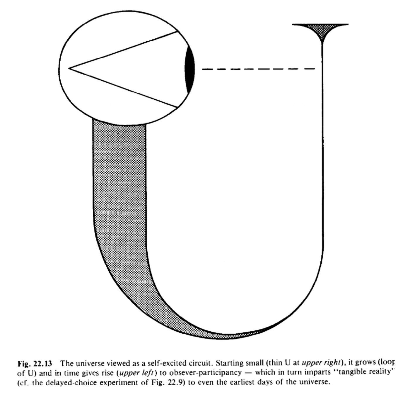 - “A picture to inspire a thought … There’s the letter ‘U’. The U starts with a thin stem, the beginning of the universe. At the beginning, the universe is small. This stemmed-U gets fatter as we go up to this side of the letter. And at a certain point it’s terminated by a big circle, and there, there’s an eye sitting and that eye is looking back to the first days of the universe … In so far as the act of observation has anything to do with what we do when we ascribe reality to what we see, then we can say, this observer who was brought into existence by the universe, has, by his acts of observation, a part in bringing that universe itself into being.” — John Wheeler