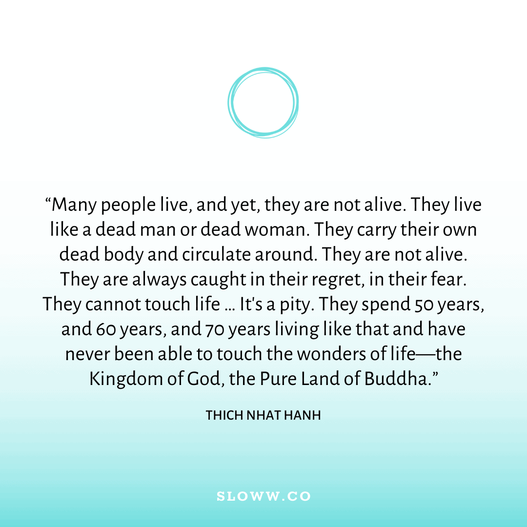 “Many people live, and yet, they are not alive. They live like a dead man or dead woman. They carry their own dead body and circulate around. They are not alive. They are always caught in their regret, in their fear. They cannot touch life … It’s a pity. They spend 50 years, and 60 years, and 70 years living like that and have never been able to touch the wonders of life—the Kingdom of God, the Pure Land of Buddha.” — Thich Nhat Hanh