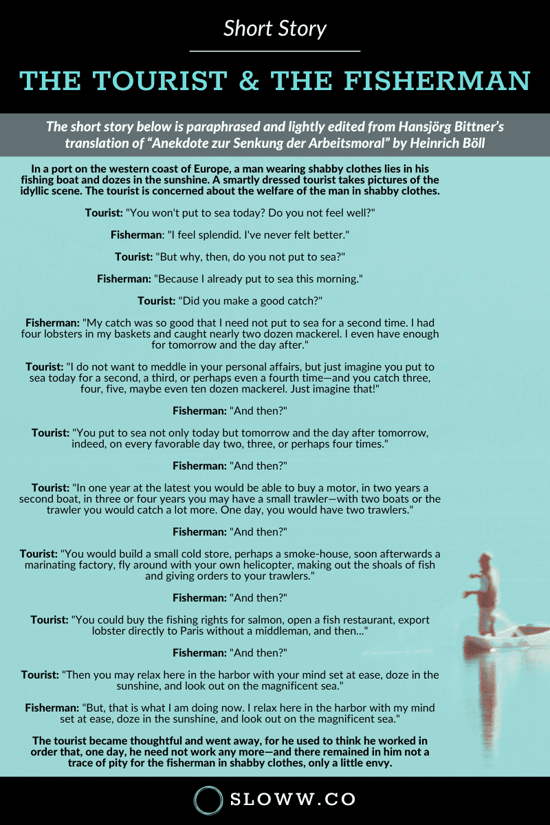 The short story or parable of the tourist and the fisherman (also known as the parable of the Mexican fisherman, the businessman and fisherman, etc) is one of my favorite short stories.
