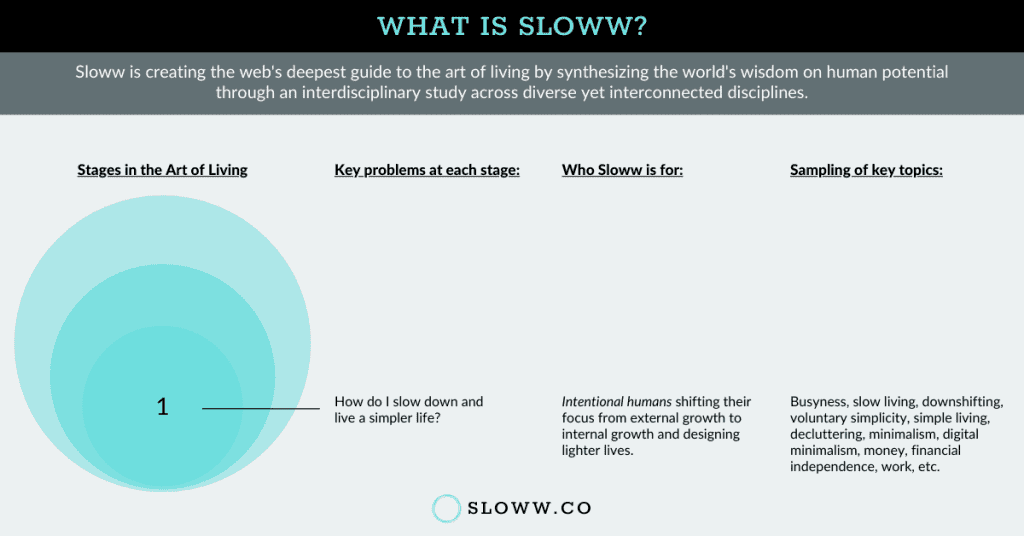 - “How do I design a lighter life?” Asking deep questions and learning (Stage Support above) initially lead to discovery of alternative lifestyle designs and more intentionality in life (Stage 1). For most people, life is heavy in both space and time—a combination of clutteredness (relationship with physical space) and busyness (relationship with psychological time). Sloww supports slowing down and simplifying in a fast, materialistic world because this is the seed/gateway to everything else: subtracting the superficial “stuff” (physical and psychological clutter), shifting inward where we can meet life face-to-face, and creating the inner space for all the transformation that comes next.